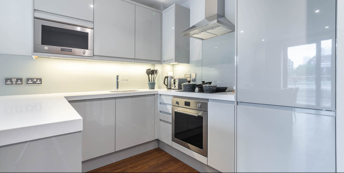 The kitchen is fitted with high-gloss designer units, a luxurious quartz stone worktop, and premium integrated Smeg appliances, including a fridge/freezer and dishwasher. The living areas are designed to impress, finished with light grey painted walls, smooth white ceilings, and walnut veneered doors — creating a sleek, contemporary atmosphere throughout.