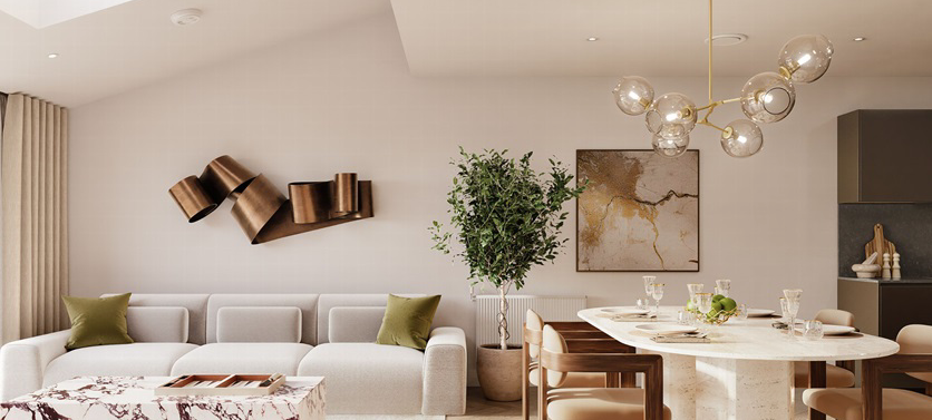 The open-plan living area is ideal for entertaining, featuring bi-fold doors that open onto your private landscaped garden, seamlessly blending indoor and outdoor living. The fully fitted kitchen comes with built-in appliances, ensuring both style and functionality.